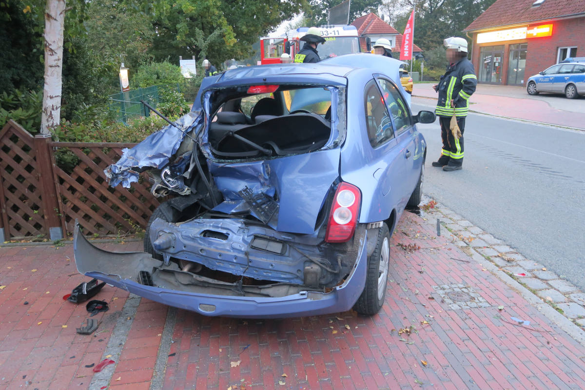 Enorme Schäden sind am Donnerstag, 13. Oktober 2022, gegen 07:20 Uhr, bei einem Verkehrsunfall in Huntlosen entstanden.