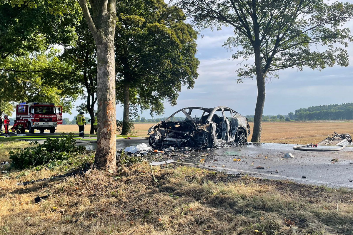 Das E-Auto brannte nach der Kollision aus. (Bildquelle: Freiwillige Feuerwehr der Stadt Bergen)