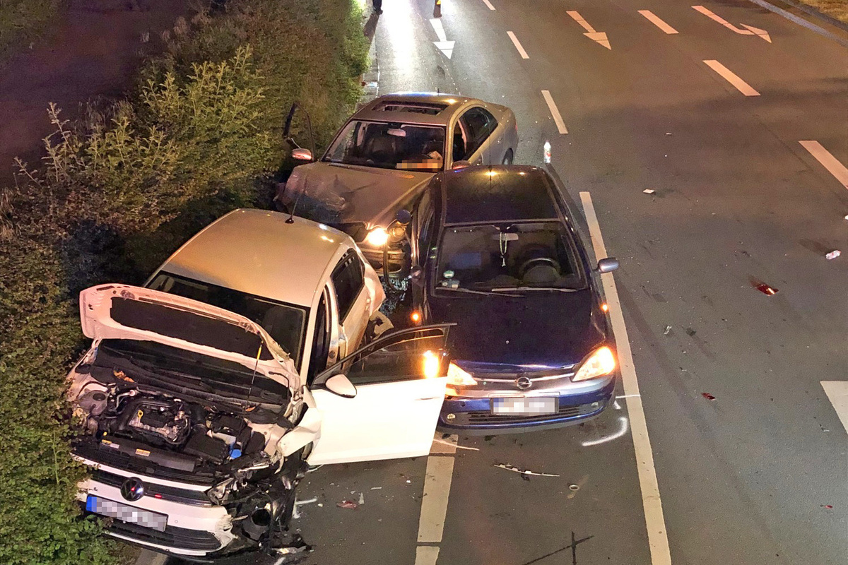 Nach wenigen hundert Metern erreichten beide PKW die Ampel-Kreuzung in Höhe Karl-Arnold-Straße. Dort standen zur Unfallzeit drei Fahrzeuge und warteten auf Grünlicht. Dem 19-Jährigen gelang es rechtzeitig zu bremsen. Die 19-jährige Fahrerin kollidierte mit den dort stehenden Fahrzeugen und schob sie ineinander (Foto). Bei den Unbeteiligten handelte es sich um eine 43-jährige Hagenerin (im VW Polo), einen 25-jährigen Iserlohner (Opel Corsa) sowie einen 41-jährigen Hertener (Mercedes Benz), in dessen Fahrzeug sich zudem eine Dame aus Oer-Erkenschwick (65) befand.