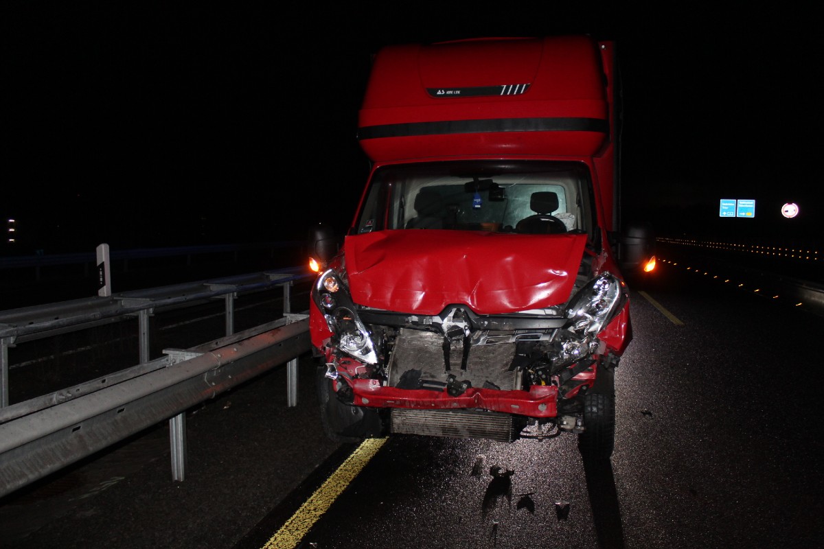 Der 22 jährige Fahrer eines Kleintransporters fuhr infolge Unachtsamkeit auf einen vor ihm fahrenden Lastzug auf. Der Transporter wurde durch den Aufprall so stark beschädigt, dass er nicht mehr fahrbereit war und abgeschleppt werden musste.