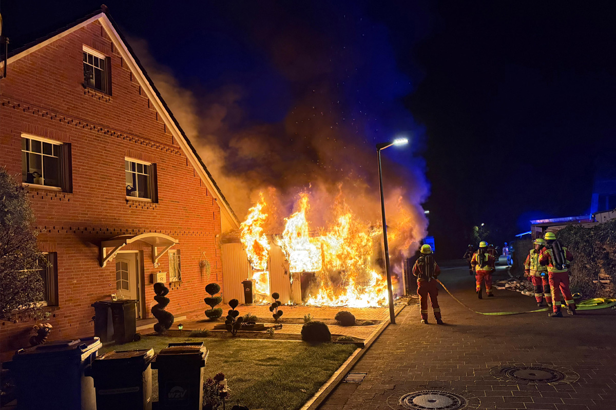 Am frühen Donnerstagmorgen, 23.10.2025, brannte in Kaltenkirchen (SH) eine Garage samt Pkw vollständig aus. Die Flammen griffen auf den Dachstuhl einer Doppelhaushälfte über. Acht Personen waren betroffen, mussten aber nicht ins Krankenhaus. Dank des schnellen Einsatzes von rund 60 Feuerwehrkräften konnte Schlimmeres verhindert werden.