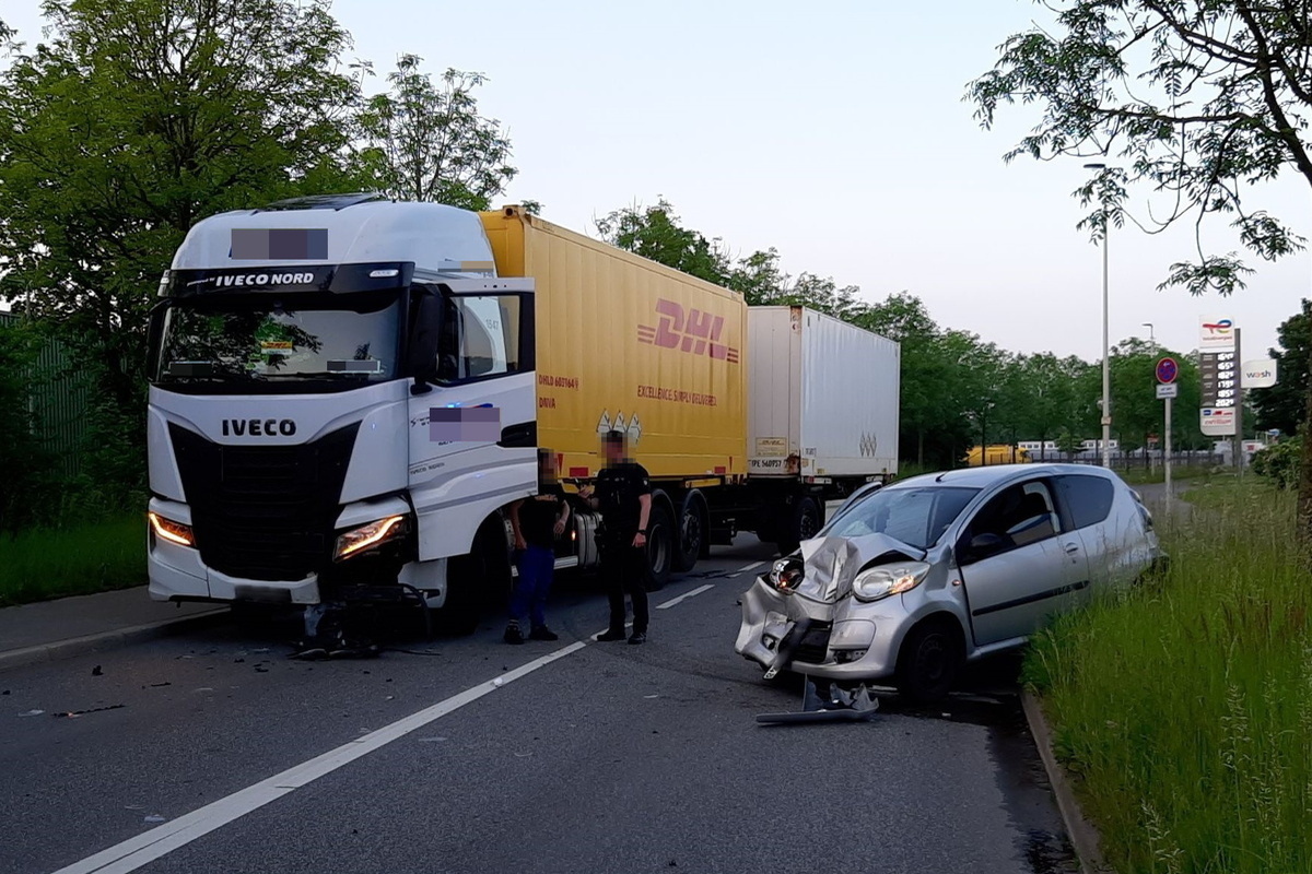 Am Samstag kam es im Bereich der Tankstellenausfahrt in der Edisonstraße zu einem Verkehrsunfall zwischen einem Lkw und einem Auto. Der Fahrer des Pkw wurde schwer verletzt. Der Lkw-Fahrer stand unter Alkoholeinfluss.