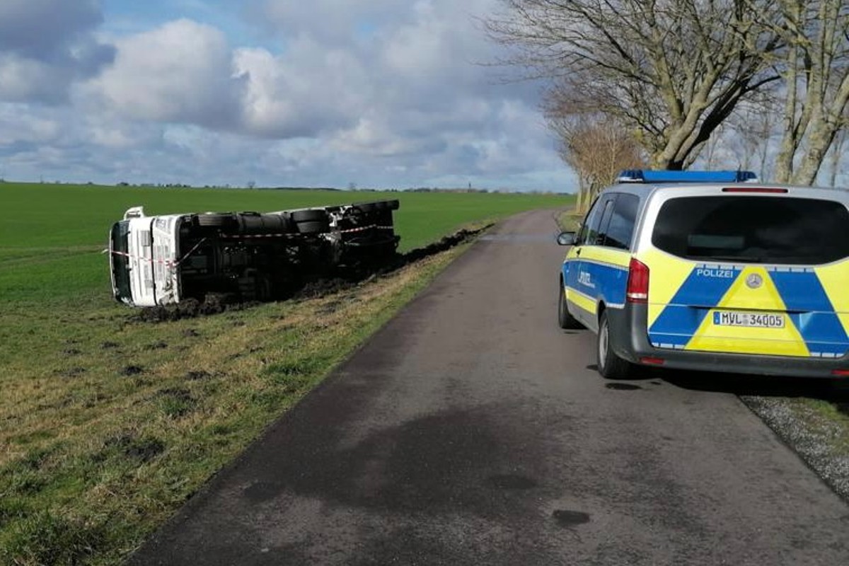 In der Gemeinde Kramerhof kam am Dienstagmorgen (22.02.2022), gegen 09:30 Uhr, ein 58-Jähriger mit einem Sattelschlepper samt Anhänger nach rechts von der Fahrbahn ab. Beim Versuch, wieder auf die Straße zu lenken, versank das Fahrzeuggespann in dem schlammigen Boden und kippte in der weiteren Folge auf die rechte Seite. Der 58-jährige Deutsche aus der Gemeinde Prohn erlitt leichte Verletzungen und wurde von Rettungskräften vor Ort medizinisch versorgt.