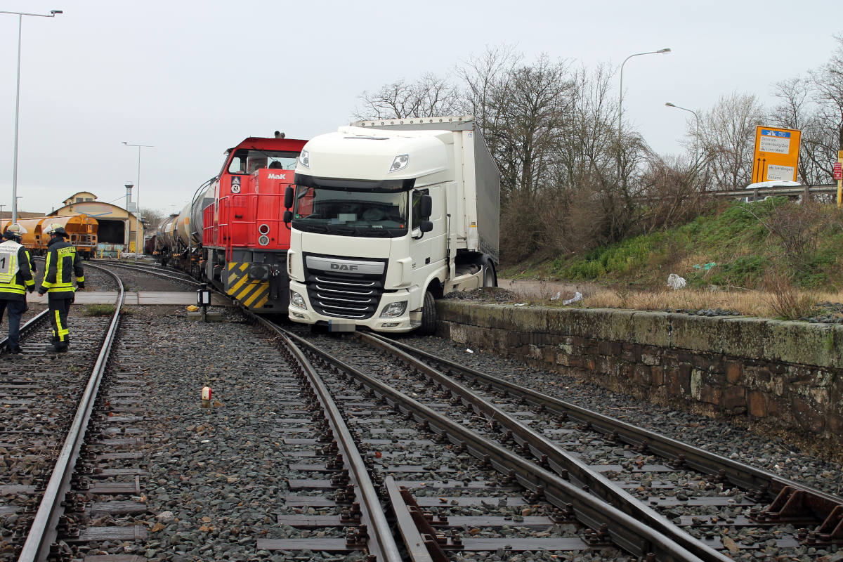Am gestrigen Montagmorgen (2. März 2020) ist ein Lkw auf einem Bahnübergang an der Carl-Sonnenschein-Straße mit einer Lok zusammengestoßen. Der Lkw-Fahrer wurde dabei schwer verletzt.