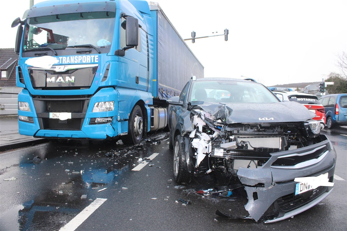 Am Freitag, 25.02.2022 gegen 13.50 Uhr kollidierte eine Pkw-Fahrerin mit ihrem Fahrzeug mit einem Lkw-Zug in Höhe der Tankstelle Dürener Straße an der Einmündung Friedenau.