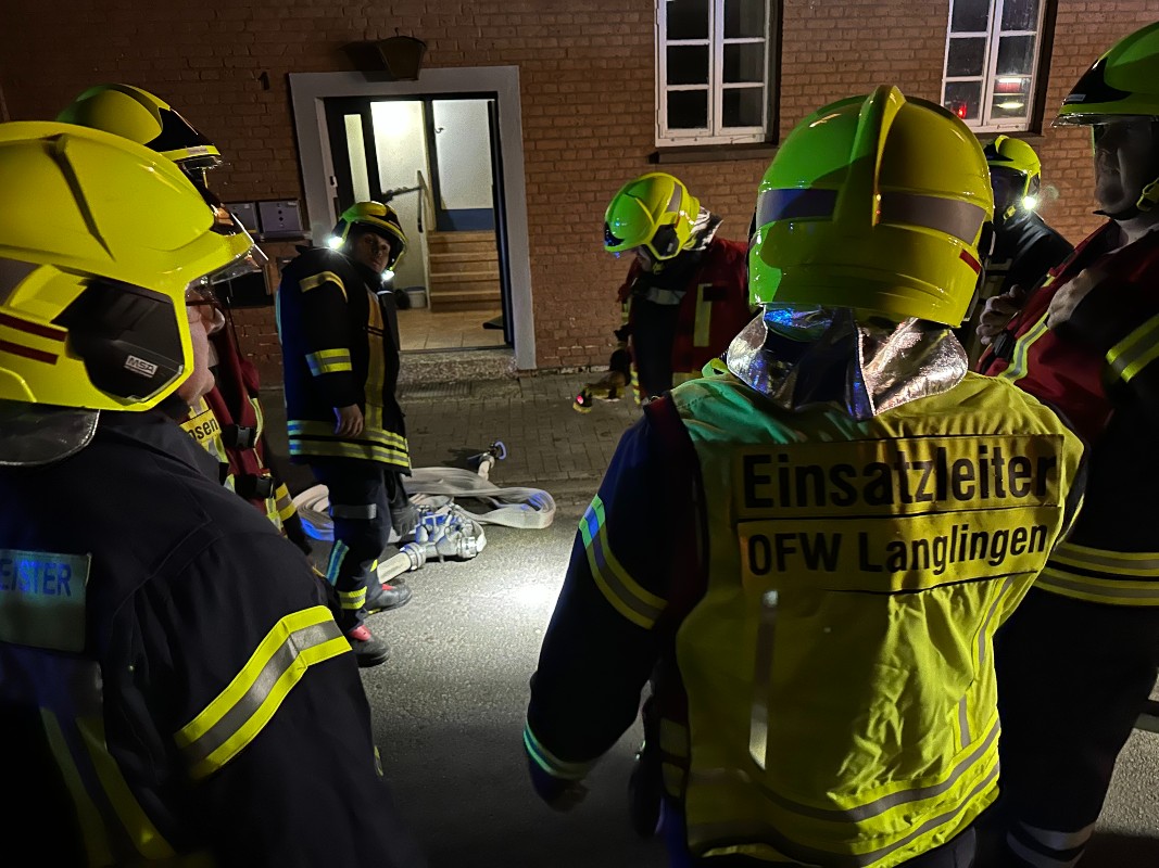 Während der Nachbesprechung wurde die Feuerwehr um 21:09 Uhr zu einem gemeldeten Küchenbrand in die Straße "Am Flootgarten" in Langlingen alarmiert. Vor Ort konnte schnell eine Verrauchung der betroffenen Wohnung festgestellt werden. Ein Trupp unter Atemschutz ging zur Erkundung in das Wohngebäude vor, während die restlichen Wohnungen evakuiert wurden.