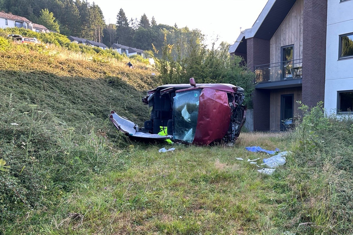 Im Bereich einer Geraden kam das Fahrzeug aus bislang unbekannten Gründen nach links von der Fahrbahn ab und stürzte eine Böschung hinab.