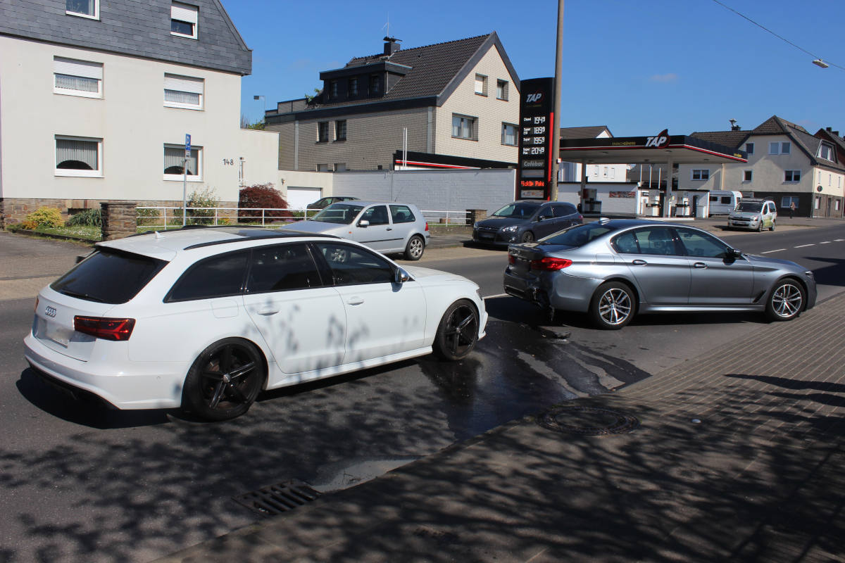 Zeitgleich fuhr ein 50jähriger Leverkusener mit seinem BMW rückwärts aus einer Einfahrt auf die Fahrbahn der Opladener Straße. Mit ihm im Fahrzeug befanden sich seine 44jährige Frau und der 4jährige Sohn. Der Audi-Fahrer sah den rückwärtsfahrenden BMW und hupte einige Sekunden, den Zusammenstoß der Fahrzeuge verhinderte er jedoch nicht. Es kam zum Zusammenstoß der beiden Pkw, wobei die 44jährige im BMW leicht verletzt wurde. An den beiden Pkw entstand erheblicher Sachschaden.