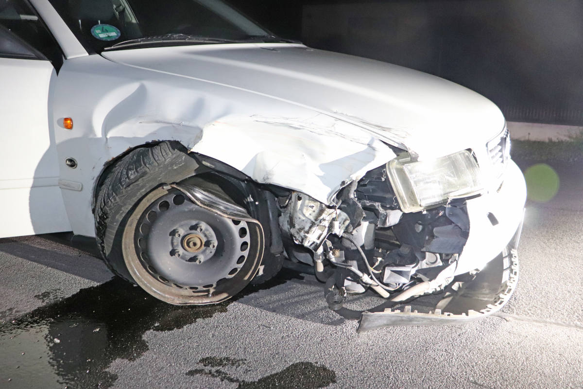 Noch während der Fahndung meldete sich eine Anwohnerin der Straße "Am Brüngersbroich" bei der Polizei, weil sie dort einen verunfallten Audi festgestellt hatte, dessen Fahrer immer wieder erfolglos versuchte, mit einem stark beschädigten Auto loszufahren.