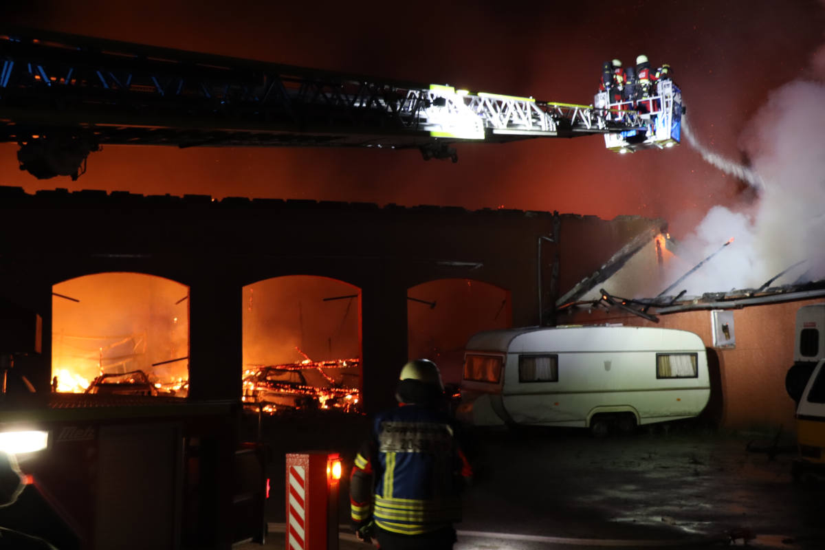 Bereits mehrere Minuten nach der Alarmierung, brannte das Gebäude schließlich im Vollbrand. Aufgrund der bestehenden Einsturzgefahr war ein Innenangriff im Hauptgebäude nicht mehr möglich, so dass mehrere Trupps, zum größten Teil unter umluftunabhängigem Atemschutz, im Außenangriff die Brandbekämpfung vornahmen. Schwierig gestaltete sich die Brandbekämpfung darin, da in dem Objekt auch mehrere Personenkraftwagen unbekannter Antriebsarten im Vollbrand standen. Ebenso wurden im Außenbereich stehende PKW durch die enorme Hitze und der Flammenbeaufschlagung bereits in Mitleidenschaft gezogen.