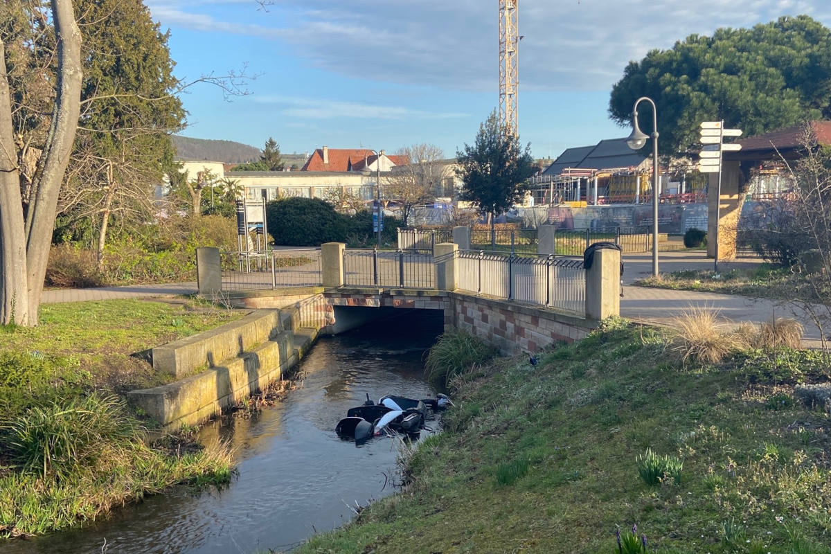 Am frühen Morgen des 18.03.2023 teilte ein Fußgänger der Polizeiinspektion Bad Dürkheim telefonisch mit, dass im Kurpark in Bad Dürkheim ein weißes Leichtkraftrad liegen würde. Wenig später stellten die Beamten das Fahrzeug im Flussbett der Isenach inmitten des Kurparks fest. Hinweise auf den verantwortlichen Fahrer ergaben sich bisher noch nicht. Das Leichtkraftrad wurde mittels Kran aus der Isenach geborgen und abgeschleppt. Die sich im Urlaub befindende Halterin des Leichtkraftrades wurde telefonisch über den Verbleib ihres Fahrzeuges informiert.
