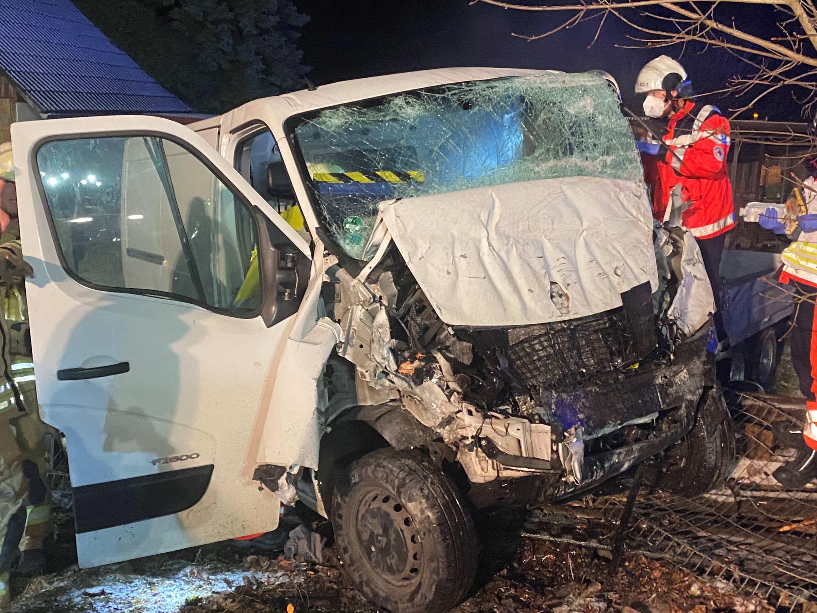 Gegen 04.20 Uhr fuhr der junge Mann mit einem Kleintransporter des Typs Renault Master von Stockach kommend auf der B14 in Richtung Tuttlingen. Vermutlich infolge einer nicht – an die zu dieser Zeit winterlichen Straßenverhältnisse – angepassten Geschwindigkeit, querte der Renault, kurz nach dem in Fahrtrichtung links gelegenen Einmündungsbereich B14/L440/Heudorf, zunächst die gesamte Fahrbahn der Bundesstraße und kam nach links von der Fahrbahn ab. Nach dem Gegenlenken querte der Kleintransporter erneut die Bundesstraße nach rechts, fuhr über eine Grünfläche und über den in Fahrtrichtung rechts gelegenen Einmündungsbereich B14/L440/Neuhausen. Schließlich prallte der Kleintransporter frontal gegen die Hauswand des Landgasthofes Schuhfranz, wobei der Fahrer im Fahrzeug eingeklemmt und dabei mit mehreren Frakturen schwer verletzt wurde. Durch die Wucht des Aufpralls drehte sich der Kleintransporter um 90 Grad, durchbrach einen angrenzenden Zaun und stieß noch gegen zwei dort abgestellte Autoanhänger. Am Unfallort zusammen mit Rettungsfahrzeugen eintreffende Feuerwehr befreite den 20-Jährigen aus dem stark deformierten Renault. Nach einer Erstbehandlung brachten DRK-Rettungskräfte den Schwerverletzten zur weiteren Behandlung in eine Klinik. Durch den Unfall entstand nach erster Einschätzung Sachschaden in Höhe von mindestens 20000,- EUR, wobei der entstandene Schaden am Gebäude noch nicht feststeht. Ein Abschleppdienst kümmerte sich um den Abtransport des Kleintransporters.