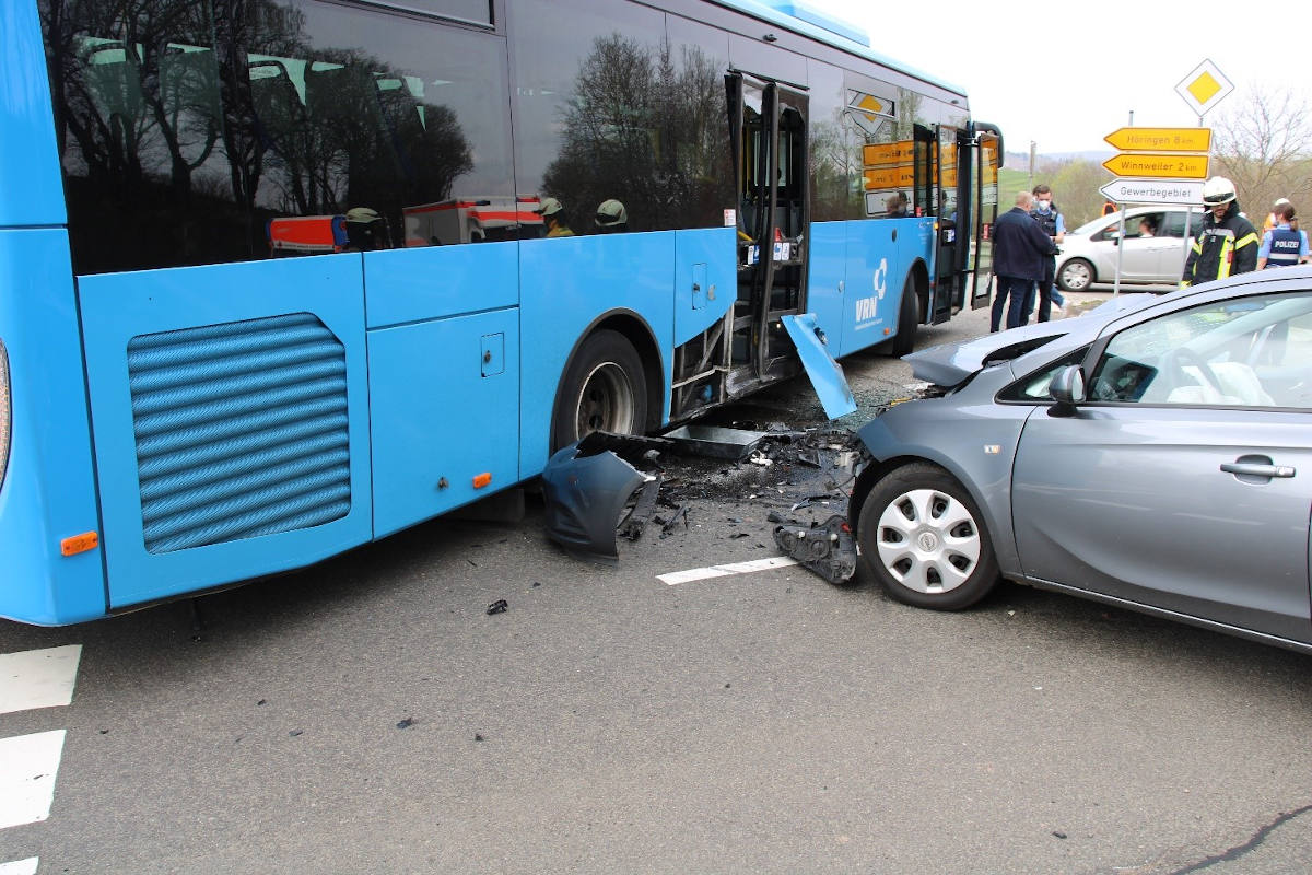 Der Busfahrer wollte mit seinem Fahrzeug, aus Richtung Lohnsfeld kommend, auf die L390 nach Winnweiler einbiegen. Hierbei übersah er einen aus Richtung Alsenbrück-Langmeil kommenden Kleinwagen. Die Fahrerin des Kleinwagens konnte nicht mehr bremsen und stieß gegen die Seite des Busses. Fahrerin und Beifahrer des Kleinwagens wurden glücklicherweise nur leicht verletzt. Ihr Fahrzeug erlitt jedoch einen Totalschaden. Auch der Linienbus wurde erheblich beschädigt. Die Insassen des Busses blieben unverletzt.