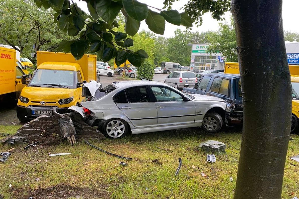 Sie überholte auf der Fahrt stadtauswärts ein 45km/h-Auto rechts über den Standstreifen. Beim Wiedereinscheren nach links verlor sie die Kontrolle über ihren 3er BMW, rutschte quer über die Fahrbahn und schleuderte auf das gegenüberliegende Grundstück, wo sie mit zwei Bäumen und zwei geparkten Pkw kollidierte. Die Fahrerin wurde leicht verletzt, der Sachschaden liegt bei mindestens 12.000 Euro.