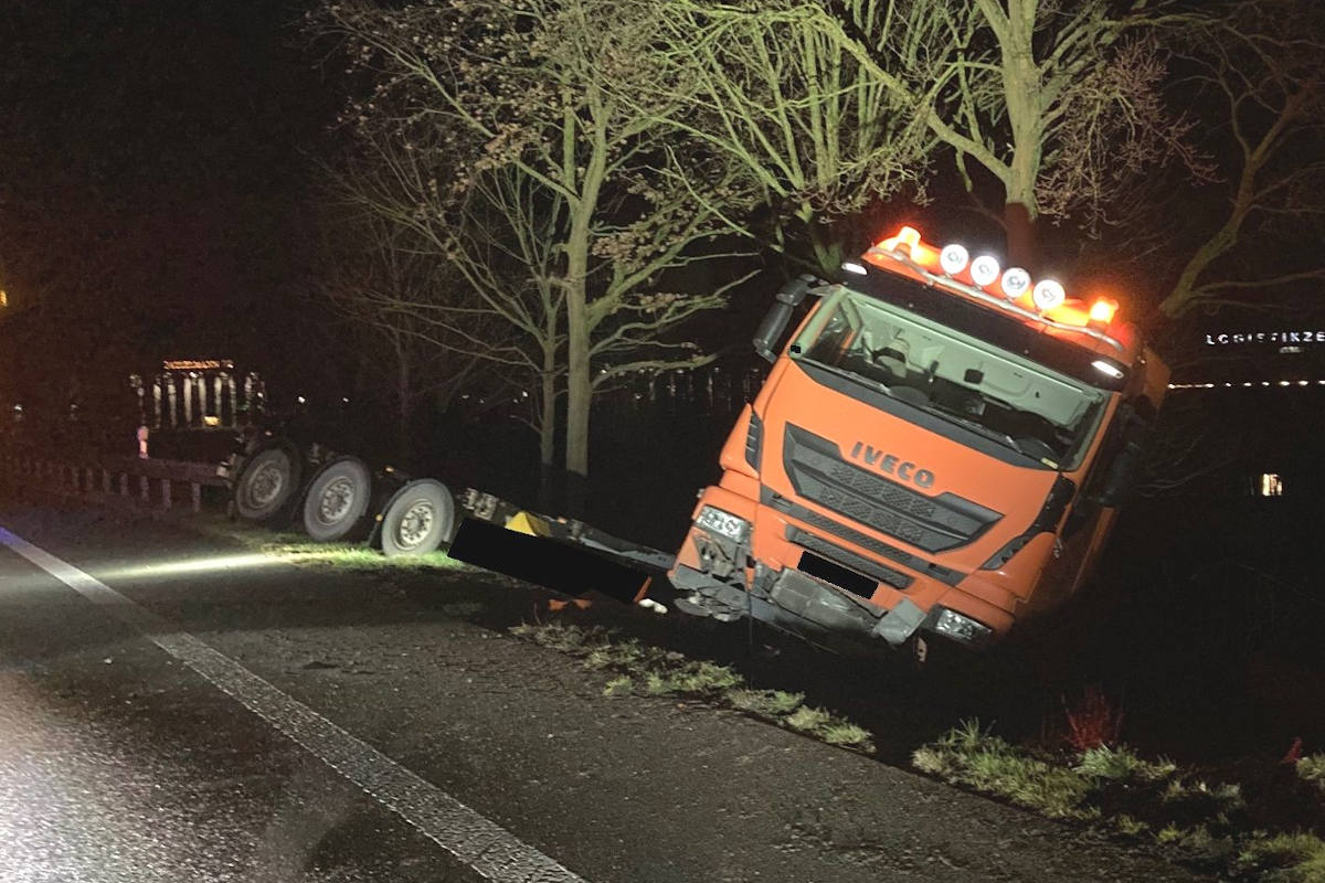 In der Nacht zu Samstag verlor ein Lkw-Fahrer auf der Berliner Straße auf glatter Fahrbahn die Kontrolle über seinen unbeladenen Sattelschlepper und rutschte in den Straßengraben.