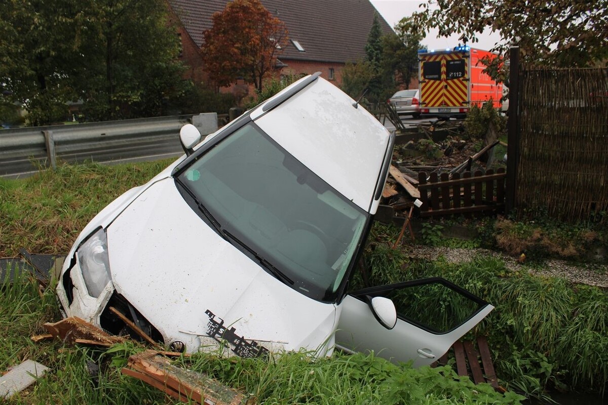 Nachdem die Lübbeckerin mit ihrem Auto zunächst über einen Bordstein rutschte, geriet ihr Fahrzeug im weiteren Verlauf auf die dortige Grundstücksmauer mit Holzzaun. Die überfuhr der Skoda noch mehrere Meter, riss die Zaunelemente aus sämtlichen Verankerungen und kollidierte schließlich mit einem Holzverschlag, bevor die Irrfahrt in einem Bach endete.