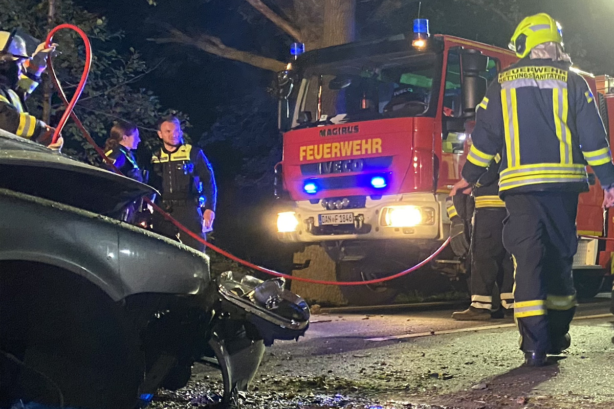 Auf der B191 bei Quickborn (Lüchow-Dannenberg) kam es am Sonntagabend (14.09.2025) zu einem schweren Verkehrsunfall. Ein Pkw prallte mit hoher Geschwindigkeit gegen eine Eiche. Der Fahrer wurde im Wrack eingeklemmt und schwer verletzt.