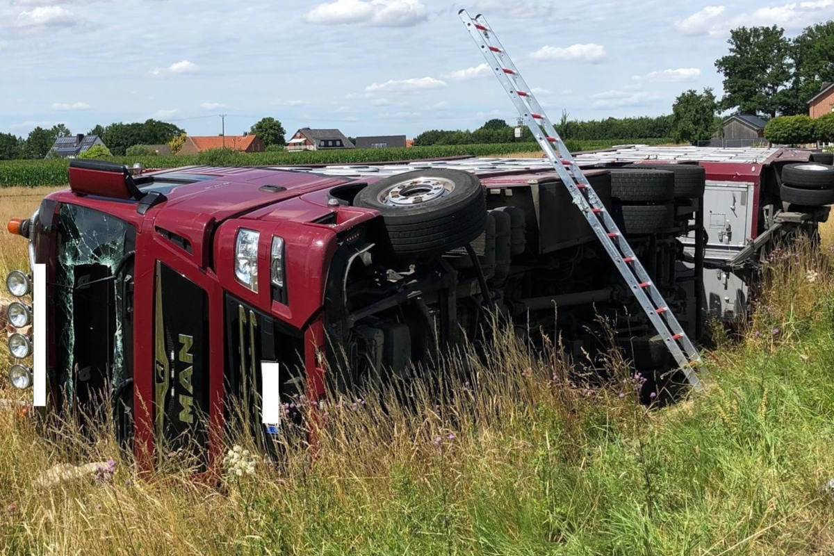 Ein mit 160 Schweinen beladener Lkw ist am Donnerstag (14.07.22) auf der L835 umgekippt.