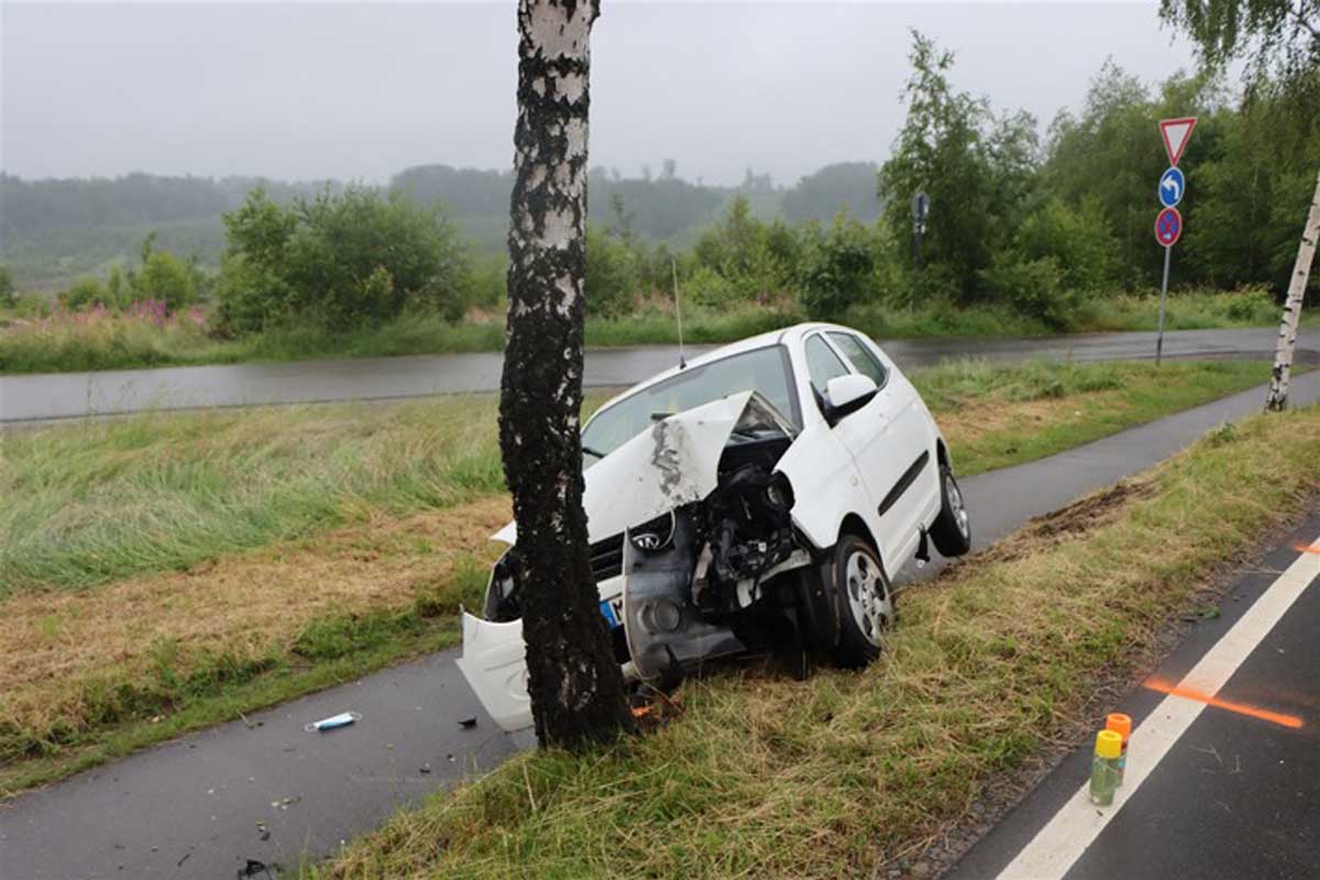 Aus bislang ungeklärter Ursache kam sie in einer Linkskurve auf regennasser Fahrbahn mit nicht angepasster Geschwindigkeit nach rechts von der Fahrbahn ab und kollidiere dort frontal mit einem Baum.