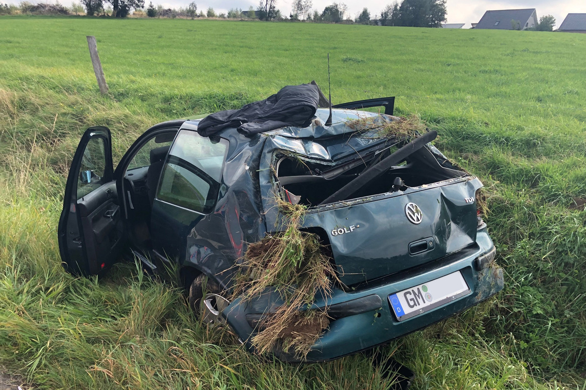 Auf der Kreisstraße 18 überschlug sich am Donnerstagmittag (28. September) ein VW Golf. Alle vier Insassen erlitten bei dem Unfall leichte Verletzungen.