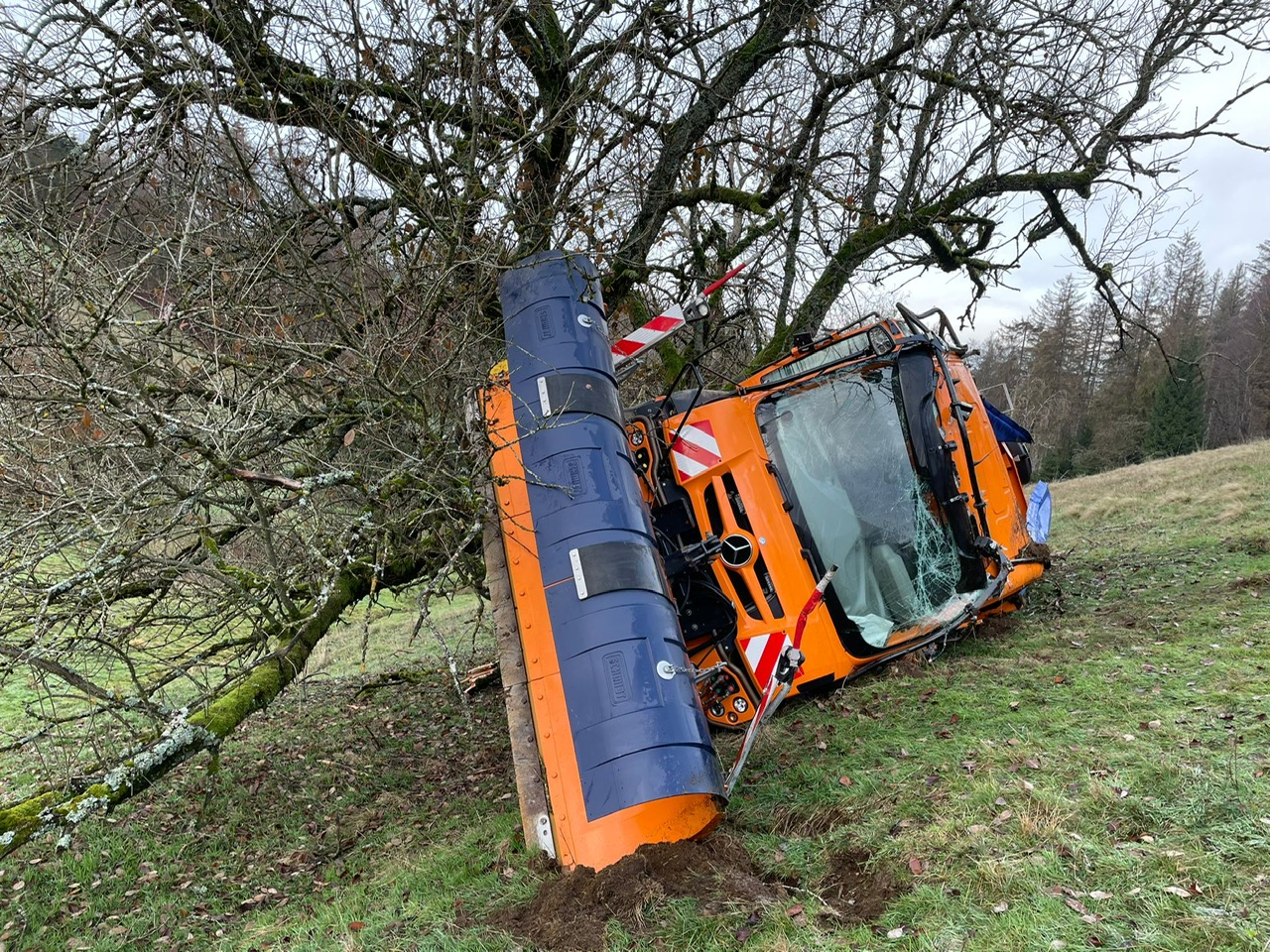 Der Baum verhinderte ein weiteres Abrutschen. Die Bergung konnte aufgrund der Witterung erst am Folgetag durchgeführt werden. Der Fahrer des Pfluges wurde schwer verletzt und ins Klinikum verbracht, am Fahrzeug entstand ein Sachschaden in Höhe von etwa 120.000 EUR.