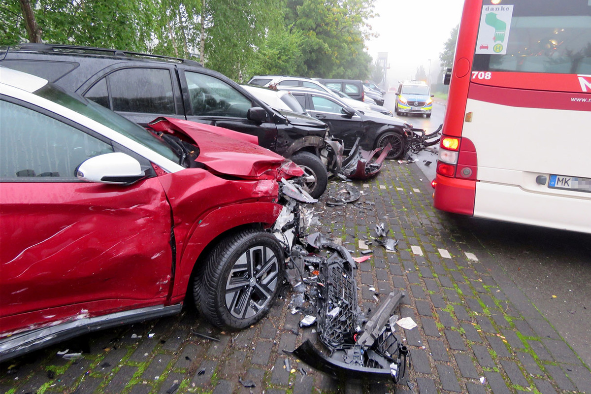 Am Montagmorgen, 4. August 2025, kam in Meinerzhagen ein Linienbus von der Straße ab und prallte gegen neun geparkte Fahrzeuge. Der Schaden liegt bei mindestens 200.000 Euro.