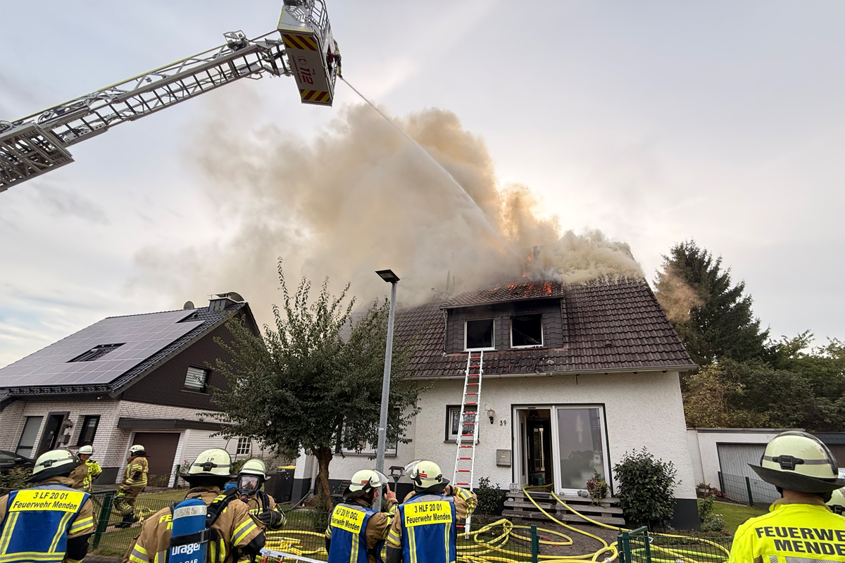 In Menden stand am Samstagabend (6.9.2025) der Dachstuhl eines Einfamilienhauses in Vollbrand. Zwei Bewohner mussten mit Fluchthauben gerettet werden und erlitten schwere Rauchgasvergiftungen. Auch ein Hund wurde aus dem Obergeschoss befreit.