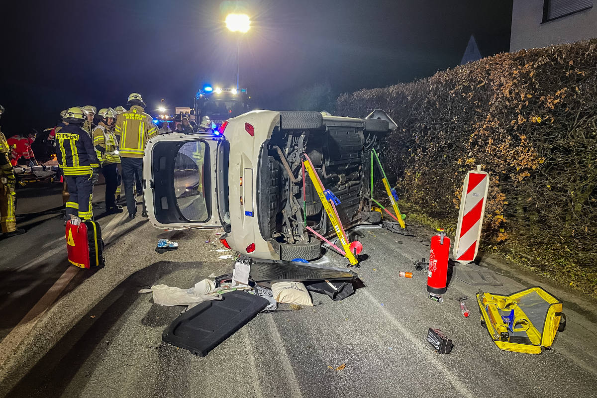 Auf der Provinzialstraße war ein PKW von der Fahrbahn abgekommen und mit einer Mauer kollidiert. Das verunfallte Fahrzeug blieb nach einem Überschlag auf der Fahrerseite liegen, sodass der Fahrer eingeschlossen war. Die Einsatzkräfte der Feuerwehr stabilisierten das Fahrzeug und konnten den Fahrer anschließend über die Heckklappe befreien. Der Rettungsdienst versorgte den Patienten und transportierte ihn in ein Krankenhaus.