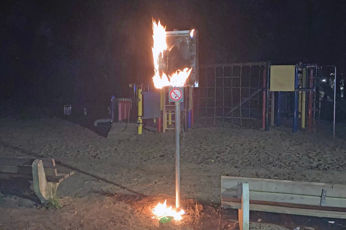 Am Montagabend (14. März 2022) brannte eine Hinweistafel, welche auf einem Spielplatz an der Sandheider Straße in Erkrath aufgestellt war.