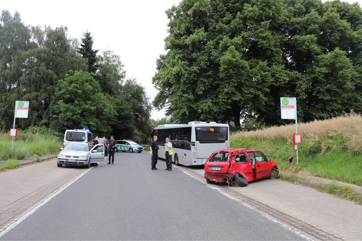 Auf Höhe der Hausnummer 23 verlor der Fahrer des Ford Fiesta in einer Linkskurve - vermutlich wegen erhöhter Geschwindigkeit - die Kontrolle über sein Auto, kam von der Fahrbahn ab und kollidierte mit einem Bus, der an der Haltestelle Metzkesberg stand.