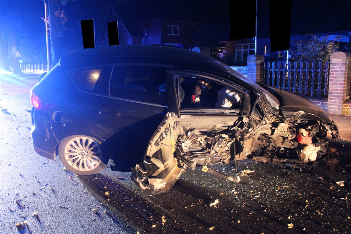 Durch einen lauten Knall wurde gegen 01.50 Uhr ein Anwohner der Stemmer Landstraße auf den Unfall aufmerksam. Bei der Nachschau auf der Straße traf er dann auf das Unfallgeschehen und benachrichtigte die Polizei. Als eine Streifenwagenbesatzung vor Ort eintraf, bemerkten die Einsatzkräfte Alkoholgeruch beim Petershäger. Dies wurde durch einen Test bestätigt. Der 40-Jährige wurde nach erster Behandlung vor Ort mit einem Rettungswagen dem Klinikum Minden zugeführt, wo ihm auch eine Blutprobe abgenommen wurde. Sein Führerschein wurde beschlagnahmt. Das nicht mehr fahrbereite Auto musste abgeschleppt werden.