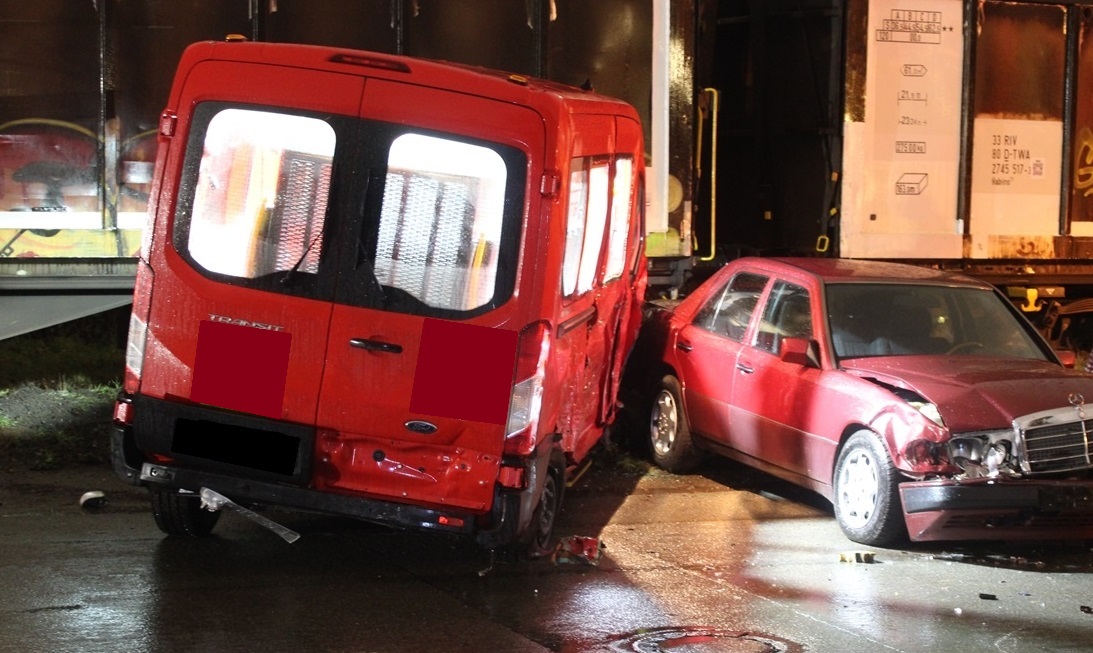 Während ihrer kurzen Abwesenheit befuhr ein Güterzug mit mehreren Wagons der Mindener Kreisbahn die hauseigene Bahnstrecke in Richtung Bismarckstraße. Der 48-jährige Triebfahrzeugführer aus dem Landkreis Nienburg konnte auf der kurvigen Strecke das Hindernis bei Dunkelheit und Nieselregen offenbar erst im letzten Moment erkennen. Trotz Gefahrenbremsung bei geringer Geschwindigkeit kam es zur Kollision mit der rechten Fahrzeugseite des Ford Transit.