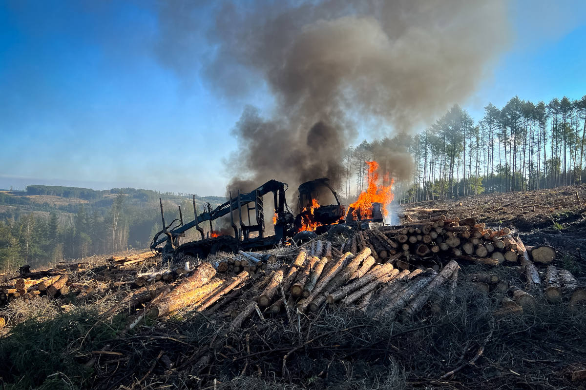 Der Rückezug, der bei arbeiten im Wald in Brand geriet, erlitt einen Totalschaden.