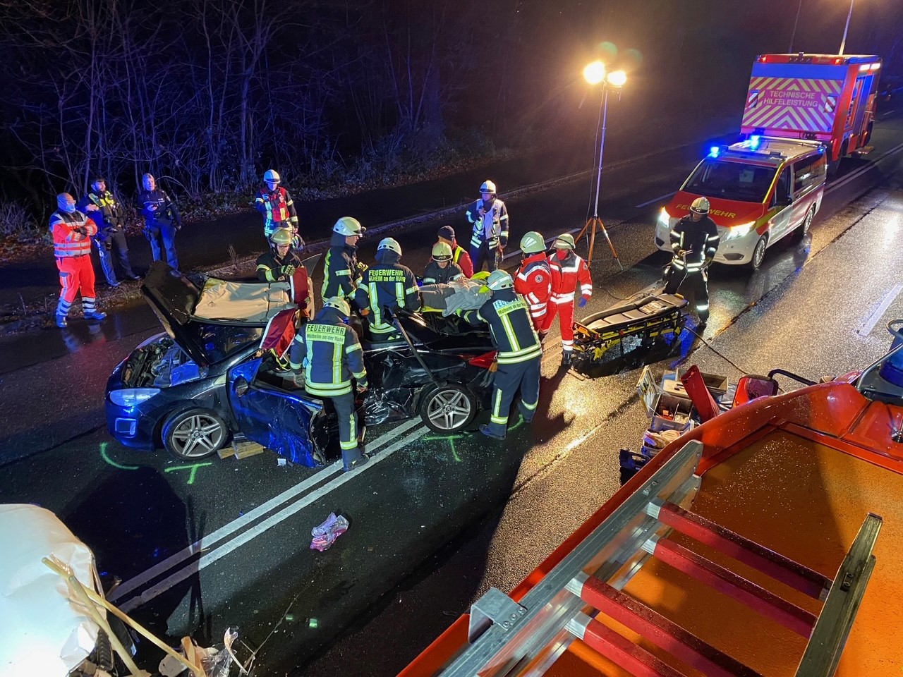 Von Seiten der Berufsfeuerwehr waren der Hilfeleistungszug aus Broich, zwei Rettungswagen und ein Notarzteinsatzfahrzeug an der Einsatzstelle. Des Weiteren war ein Rettungswagen vom DRK mit im Einsatz gebunden.
