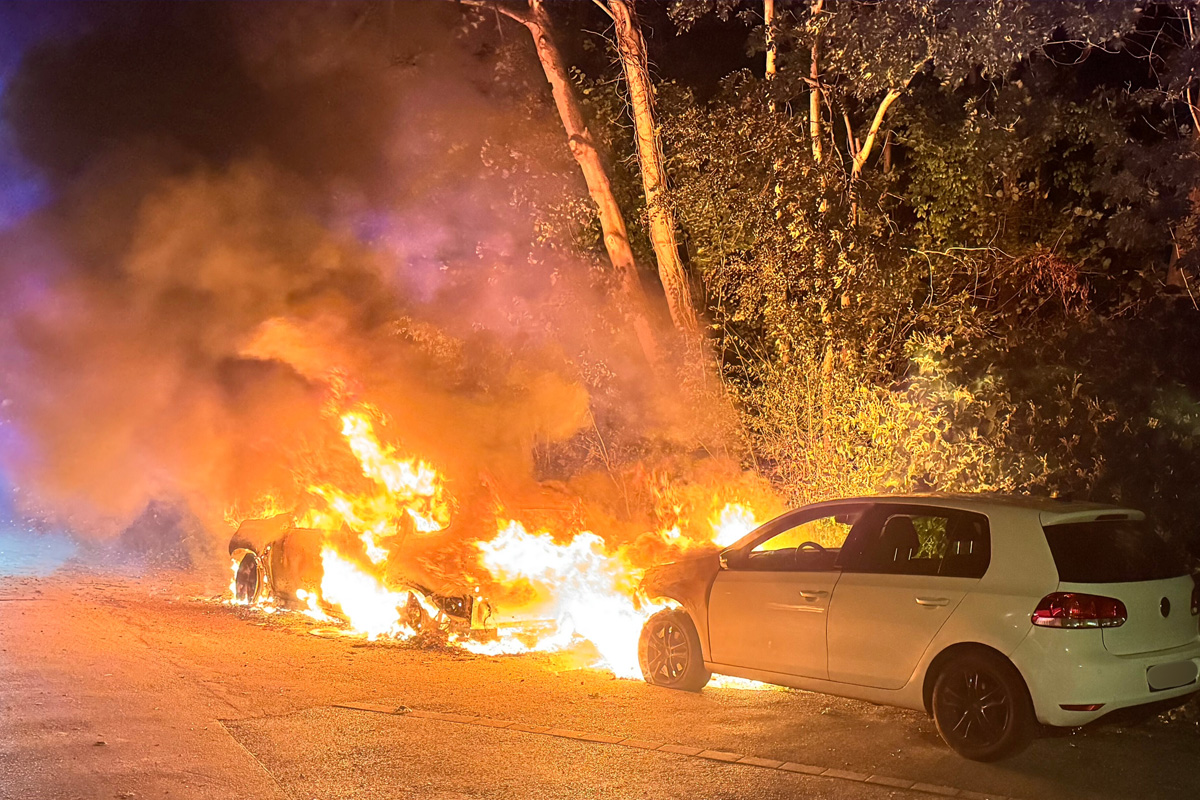 In Mülheim an der Ruhr brannte in der Nacht zu Donnerstag, 25.9.2025, ein Auto auf der Wienenbuschstraße vollständig aus. Die Flammen griffen auf ein weiteres Fahrzeug sowie Büsche und Bäume über.