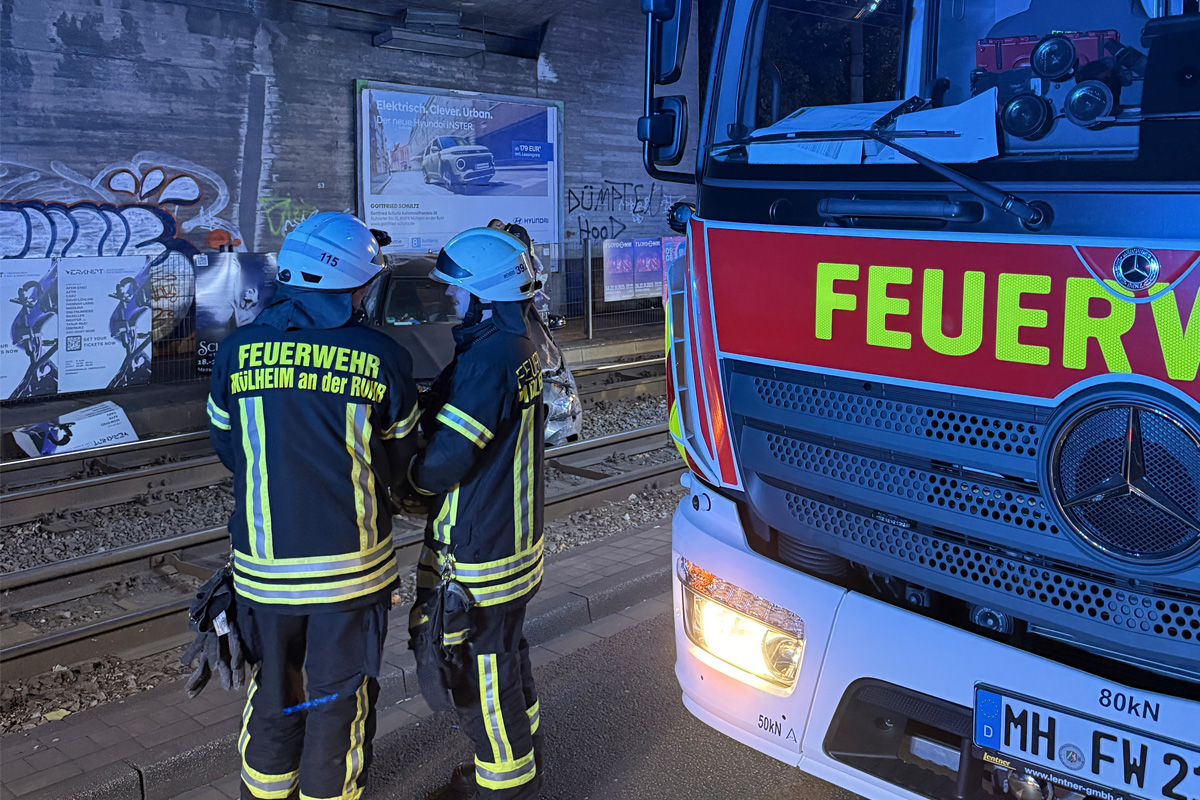 In der Nacht zum Freitag (03.10.2025) kam es auf der Mellinghofer Straße in Mülheim-Dümpten zu einem Unfall. Ein Pkw überschlug sich und kam im Gleisbett zum Stehen. Zwei Insassen wurden leicht verletzt ins Krankenhaus gebracht.