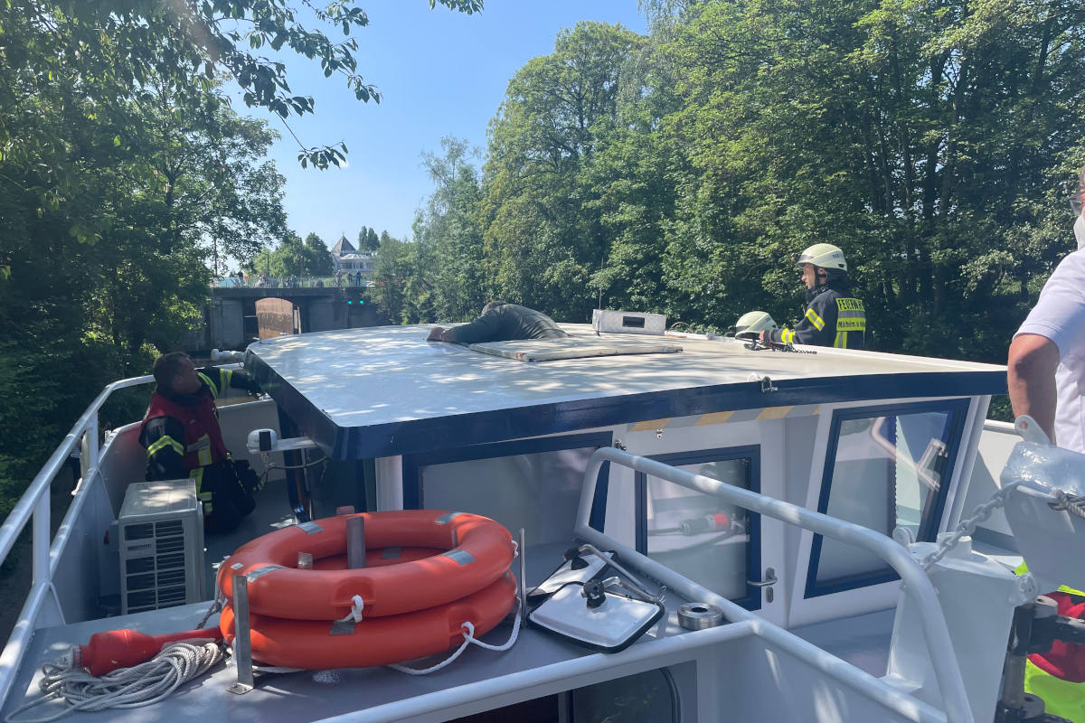 Beim Eintreffen des Rüstzuges trieb das 38,5 m lange Fahrgastschiff manövrierunfähig im Schleusenkanal. Der Schiffsführer war ansprechbar, hatte aber keine Möglichkeit mehr das Schiff zu steuern. Dank der Unterstützung einer Sportbootbesatzung konnte das Ausflugsschiff an eine Anlegestelle in unmittelbarer Nähe gezogen und dort festgemacht werden. Mit einem akkubetriebenen hydraulischen Speizer konnte die Kabine um wenige Zentimeter angehoben und der Schiffsführer aus seiner misslichen Lage befreit werden. Die leichtverletzte Person wurde durch den Notarzt untersucht und im Anschluss in ein Mülheimer Krankenhaus transportiert.