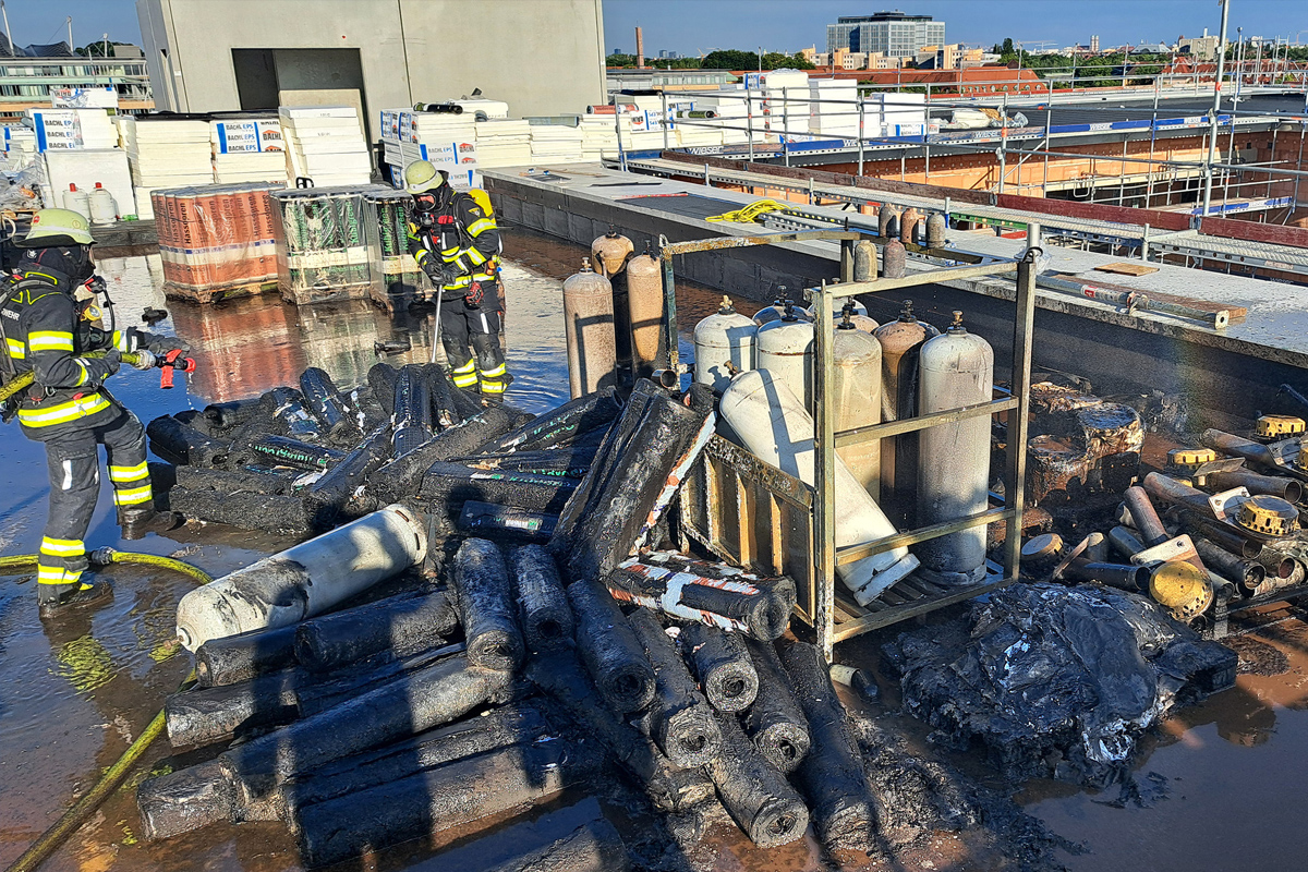 In unmittelbarer Nähe des Brandherdes befanden sich neun Gasflaschen, die für Schweißarbeiten verwendet wurden. Einige der Gasflaschen strömten aufgrund der Hitzeeinwirkung bereits ab und mussten von den Einsatzkräften gekühlt werden.