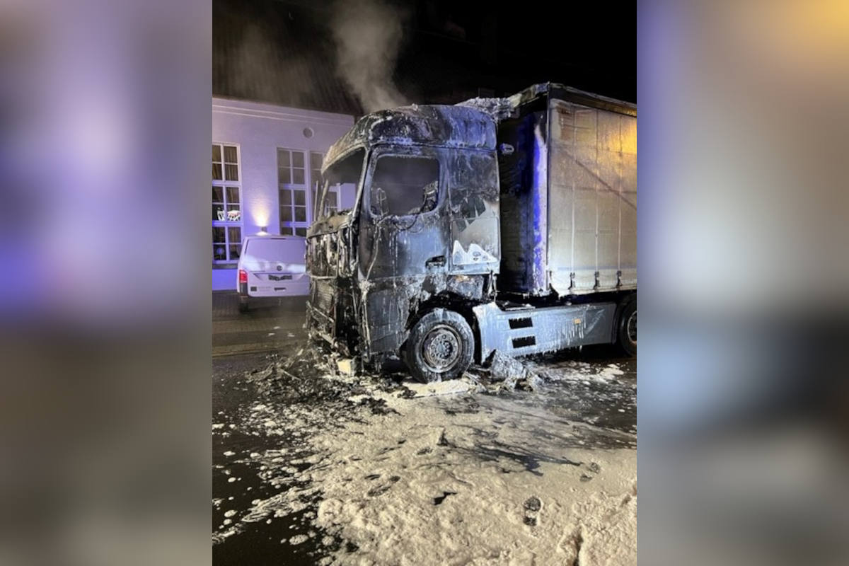 Der Fahrer berichtete, dass er während der Fahrt eine Stichflamme aus dem Motorraum bemerkte. Der Mann stoppte das Fahrzeug und verließ es. Das Feuer breitete sich auf die gesamte Zugmaschine aus. Bei Eintreffen der Polizei stand das Fahrzeug bereits in Vollbrand. Auch der Auflieger sowie zwei unbeteiligte Pkw wurden beschädigt. Aus dem Fahrzeug entwichen Betriebsstoffe. Die Feuerwehr löschte das Fahrzeug und leitete Maßnahmen zum Binden der Stoffe ein. Die Untere Wasserbehörde wurde in Kenntnis gesetzt. Die Straße wurde teilweise vollgesperrt. Die Höhe des Schadens ist noch nicht bekannt.