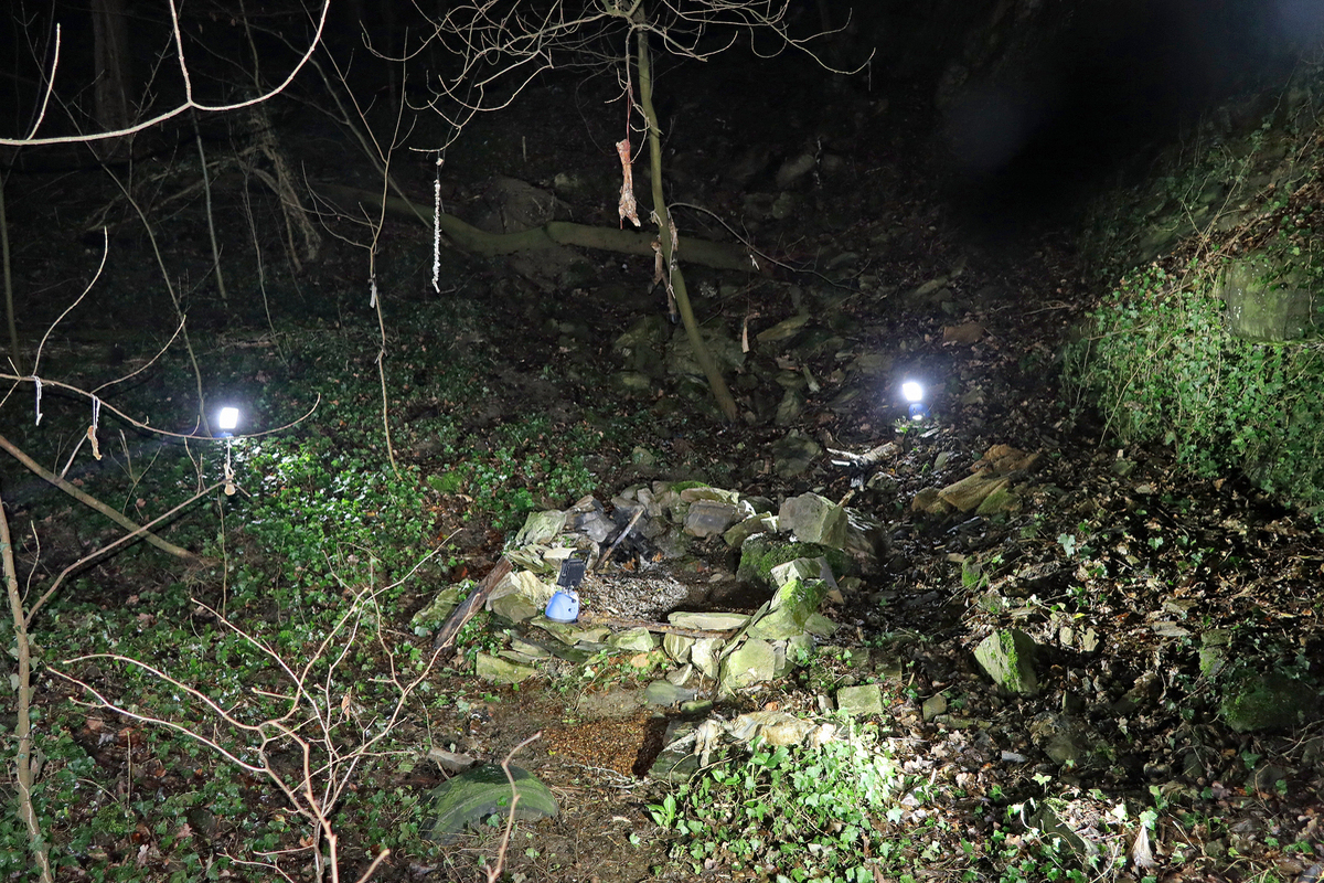 Am Montag, 12. Februar 2024, meldeten Spaziergänger den Fund mehrerer Tierkadaver in einem Waldstück unmittelbar gegenüber der Anschrift "Talstraße 168", vor der dortigen S-Bahnbrücke. Alarmierte Einsatzkräfte der Polizei stellten bei ihrem Eintreffen fest, dass Unbekannte dort Überreste von unterschiedlichen Tieren, darunter Teile von Nagetieren, einer Katze und einem Hirsch, an und um einen selbst angelegten Steinkreis abgelegt hatten.