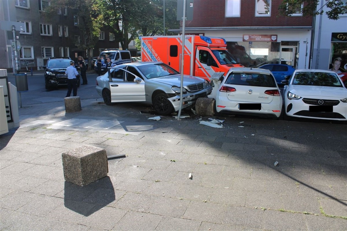 Eine 67-Jährige am Steuer eines schwarzen Ford hatte dem Fahrer (20) eines grauen Daimler die Vorfahrt genommen. Der Daimler prallte gegen den von links kommenden Ford und schleuderte dann durch die Wucht des Aufpralls gegen einen Begrenzungsstein, zwei Stromkästen, ein Verkehrsschild und ein geparktes Auto.