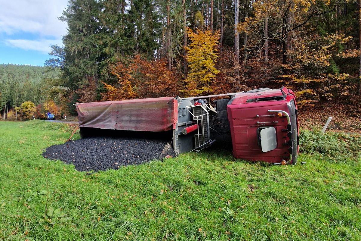 Als dem Fahrer in einer Kurve ein Fahrzeug im Gegenverkehr entgegenkam, musste er ausweichen, geriet dabei auf den Fahrbahnrand – und der Lkw kippte um.
