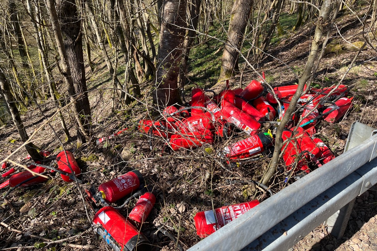 Umweltsünder haben ca. dreissig Feuerlöscher in der Natur entsorgt (Bildquelle: Polizeiinspektion Nordsaarland)