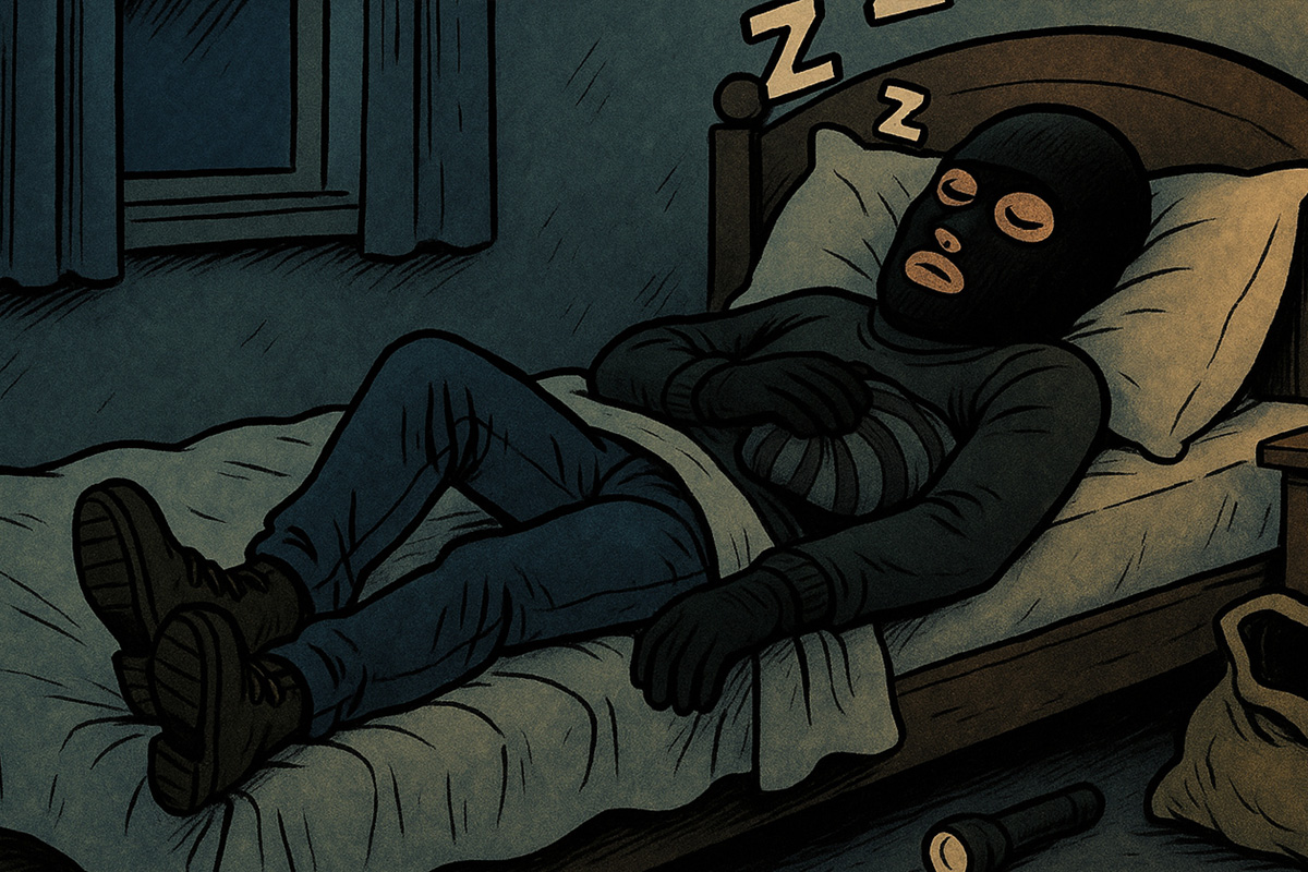 Vor lauter Tatendrang war der Eindringling während seines Einbruchs offensichtlich schläfrig geworden, sodass er sich prompt ins Schlafzimmer der Wohnung begab und in den Tiefen seiner Träume versank.