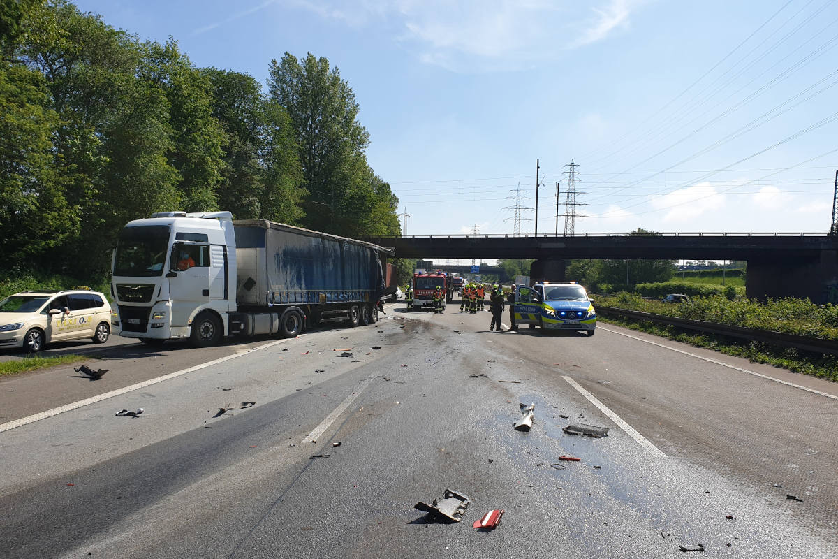 In Höhe der Anschlussstelle Oberhausen Zentrum kollidierten zuvor 2 LKW. Durch die Wucht des Aufpralls wurden Fahrzeugteile aus einem LKW herausgerissen und auf die Fahrbahn geschleudert. Auf einer Länge von über 100 Meter verunreinigte ausgelaufenes Hydrauliköl die Fahrbahn. Dadurch mussten alle Fahrspuren gesperrt werden. Die beiden LKW-Fahrer blieben glücklicherweise unverletzt.