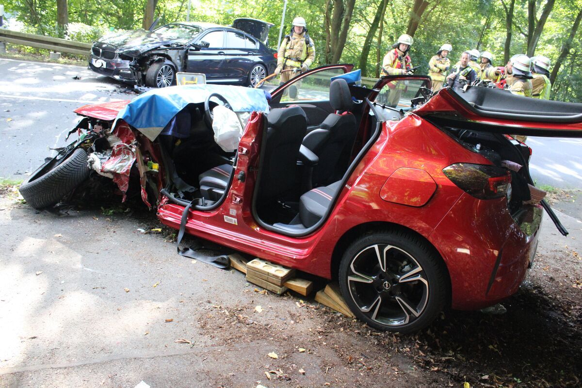 Die Unfallverursacherin verletzte sich bei der Kollision schwer und wurde in ihrem Fahrzeug eingeklemmt, so dass die alarmierte Freiwillige Feuerwehr Odenthal das Dach abtrennen musste, um sie patientenschonend zu befreien.