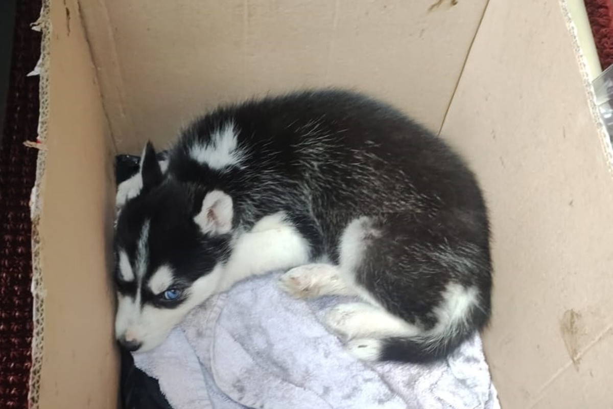 5 Wochen alter Husky-Welpe im Karton (Bildquelle: Polizeipräsidium Südosthessen - Offenbach)
