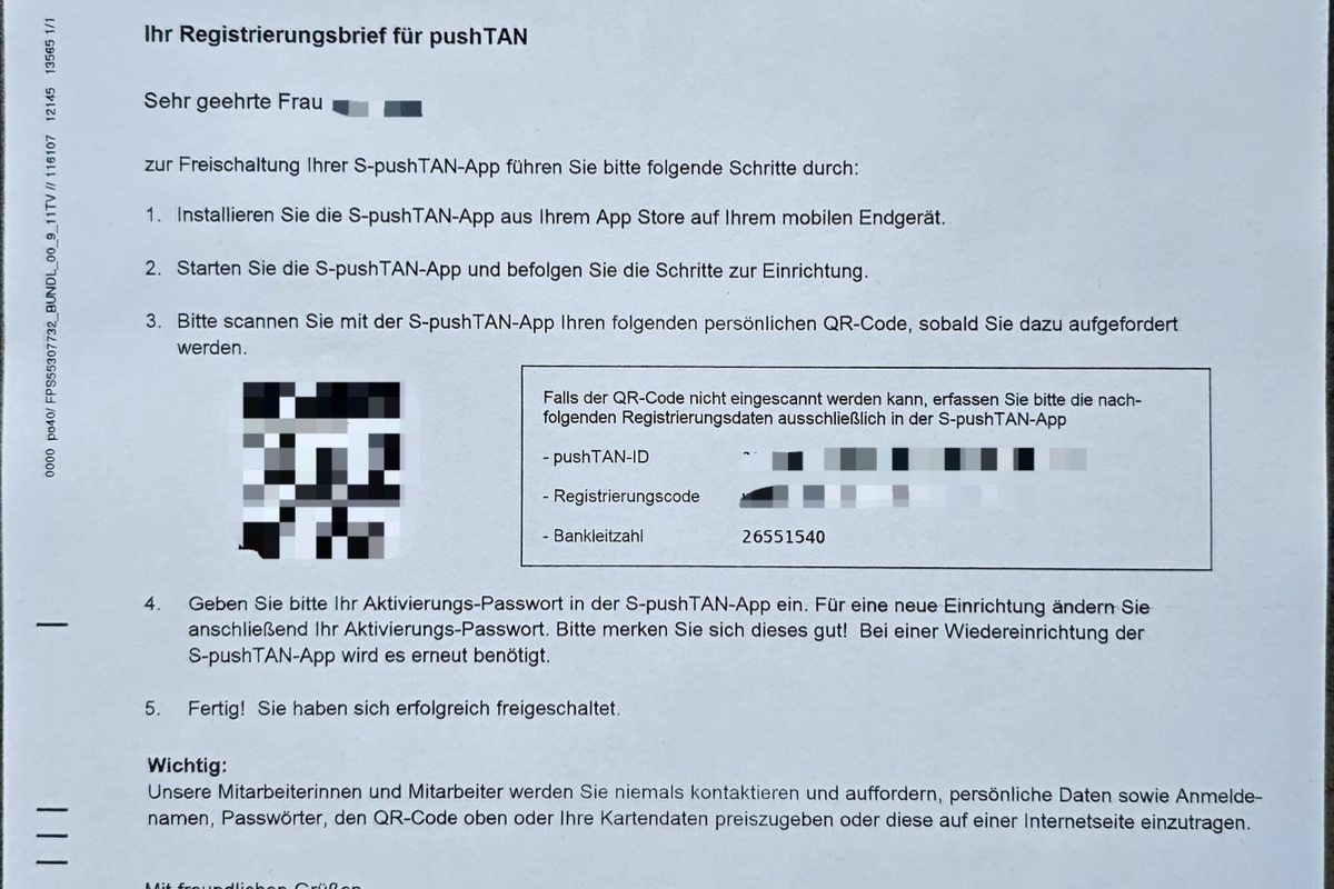 Überprüfen Sie den Absender und die Legitimität von erhaltenen QR-Codes sorgfältig, oft erfolgt in dem Anschreiben eine allgemeine Anrede als "Kunde / Kundin" und keine persönliche Anrede.