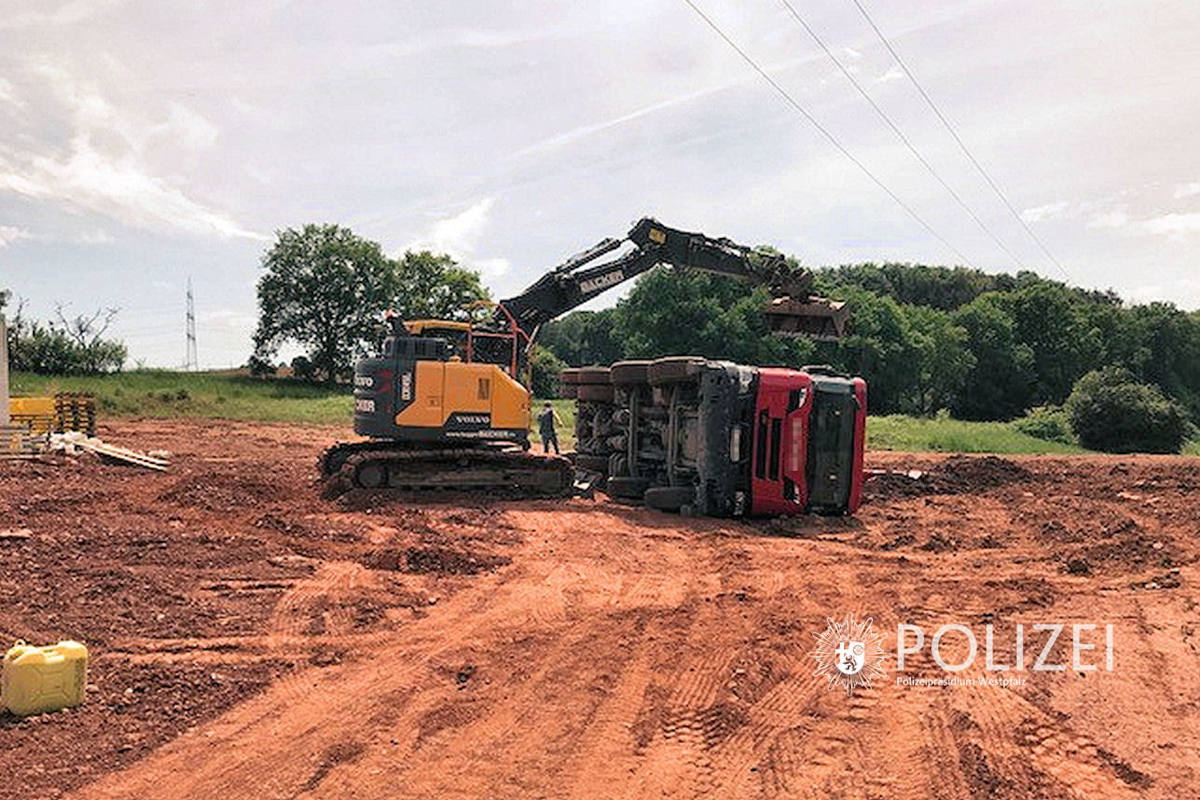 Lkw auf nicht befestigter Straße umgekippt (Bildquelle: Polizeipräsidium Westpfalz)
