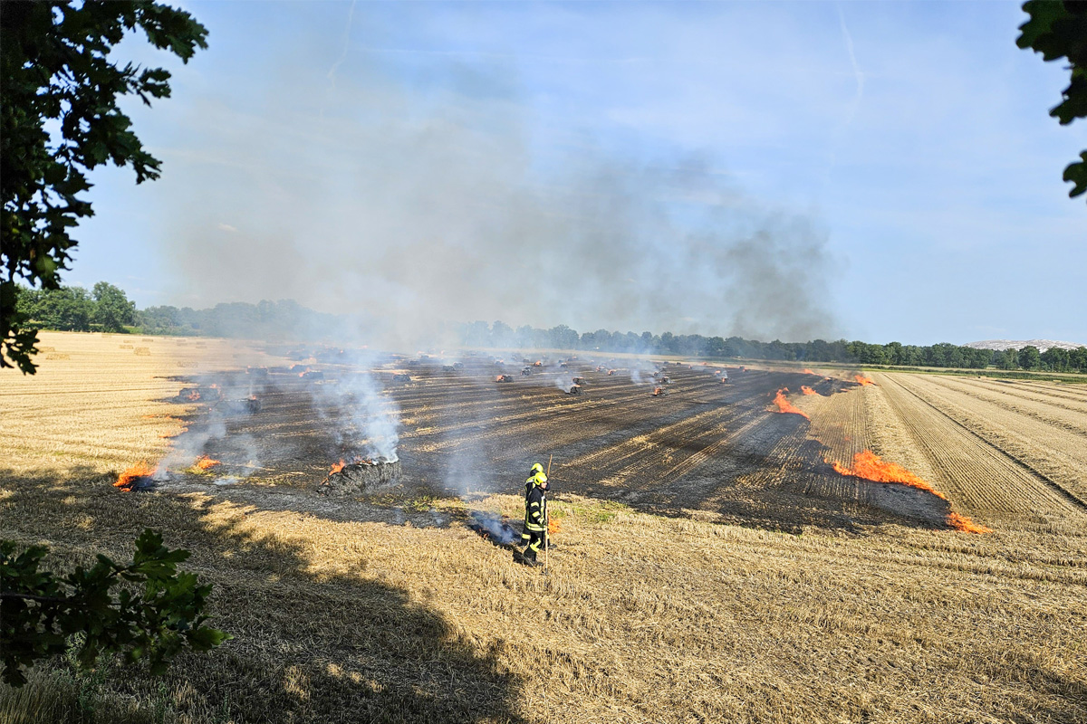 Am Samstagabend, 9. August 2025, brannte bei Papenhorst (NI) eine Quaderballenpresse und löste einen größeren Flächenbrand aus. Über 100 Einsatzkräfte aus neun Ortsfeuerwehren verhinderten eine Ausbreitung auf weitere Flächen.
